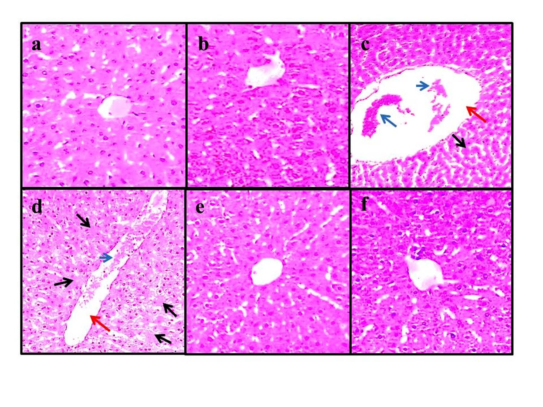Figure 2. Histological images of the experiment groups (4 µm, H&E, ×100). Groups of control (a), NAR (100 mg/kg) (b), NAR (50 mg/kg)+Isc/R group (e), and NAR (100 mg/kg)+Isc/R group (f). Cell destruction with no nuclei (black arrows), dilatation in the central hepatic vein (red arrows), and hyperemia (blue arrow) in the Isc/R group (c, d). NAR: naringenin, Isc/Rep: ischemia-reperfusion