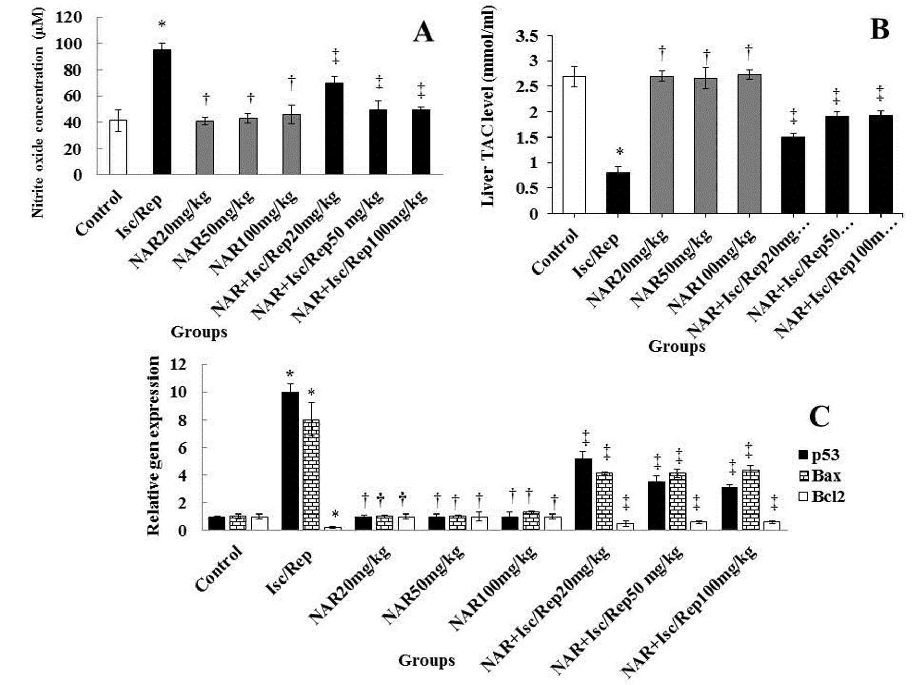 Figure 3. Isc/R and NAR affect the levels of NO (A) and TAC (B), and the expression of genes (C). *Significant differences, compared to control (P<0.05). †Significant differences, in comparison with Isc/R (P<0.05). ‡Significant differences with Isc/R (P<0.05). NAR: Naringenin, Isc/Rep: Ischemia-reperfusion, NO: nitric oxide