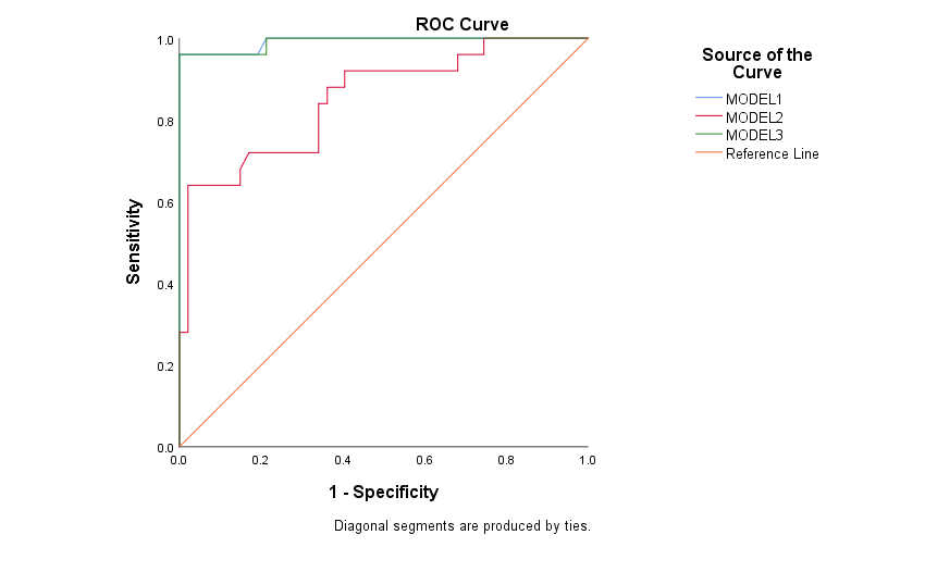 Table 2 summarizes the findings from Roc curve analysis for the three fitted models in Table 1. Moreover, ROC curve for each model was shown in Figure1. Regarding these findings, one can conclude that the model with only NGAL as the predictor could result in a rather perfect prediction of renal disorder.